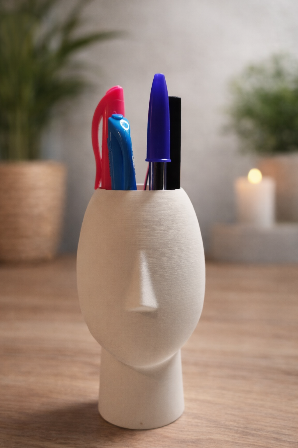 Impresso em 3D com acabamento mate e textura suave, integra-se facilmente em ambientes office, estúdios criativos ou home office.